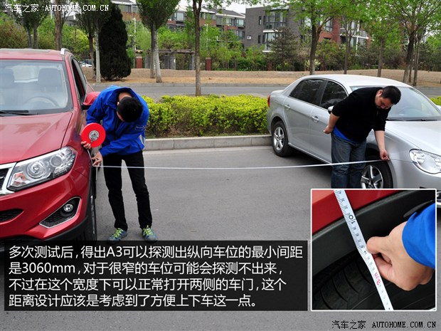 和側向車位相同,我們將兩輛模特車輛的距離不斷縮小,測試了奧迪A3對于縱向車位所需的最小間距,多次嘗試后這個最小距離定格在3060mm,也就是說只要車位兩側的車輛間距大于這個距離A3就可以停進去。這個距離設計的還是比較合理的,如果太近的話打開車門就會受到影響,我們試了一下,在最小距離的情況下,自動泊車結束后兩側的乘客都可以正好開門下車。